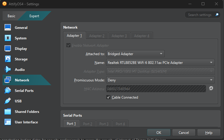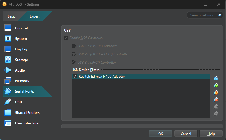 We need two network adapters, one for our regular wifi, the other one for the internal network with our target router. We also need to tell VirtualBox that there is a USB device.